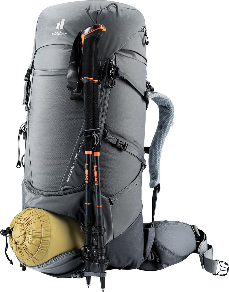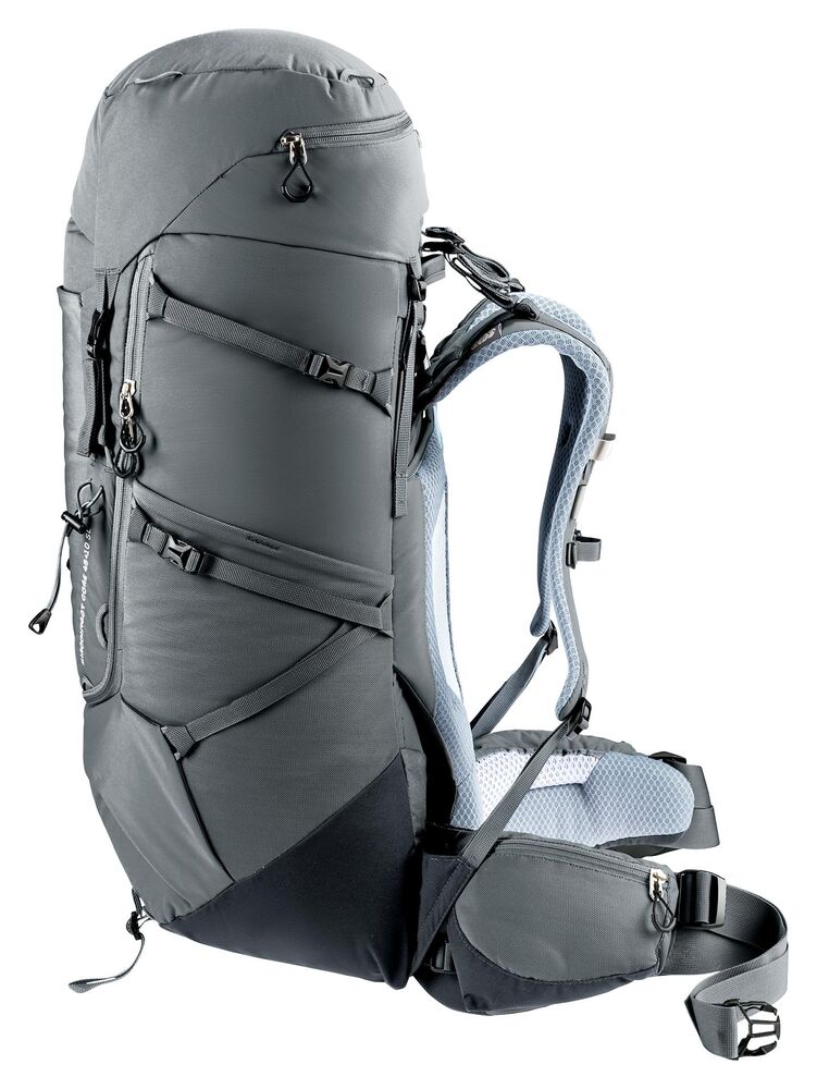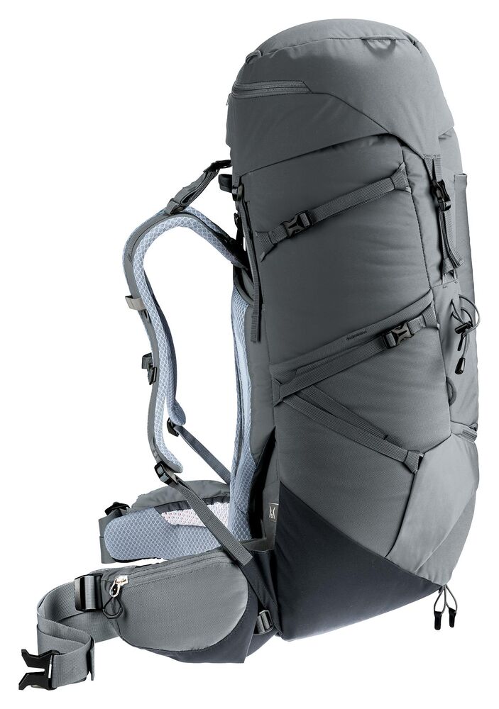 De Aircontact 45+10 SL van Deuter is een veelzijdige rugzak dankzij afneembare compressiebanden die kunnen worden aangepast aan het gebruik en de uitrusting, zodat een grote verscheidenheid aan voorwerpen kan worden bevestigd. Het Aircontact rugsysteem met Air Spacer Mesh en groot ventilatiekanaal, de ergonomische ActiveFit schouderbanden en de verstelbare borstband zorgen voor een groot draagcomfort. Optimale lastverdeling en controle over lange afstanden wordt gegarandeerd door het Y-frame, de beweegbare, nauwsluitende heupvinnen en het ergonomische, trapeziumvormige lendenkussen.