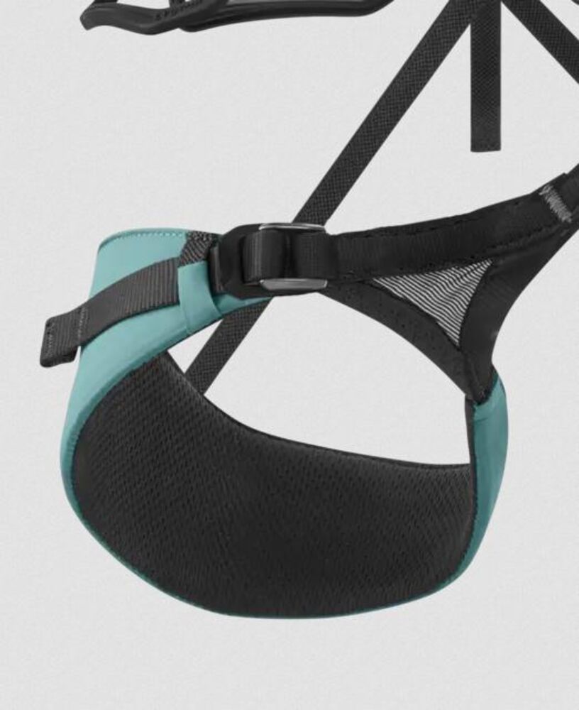- Volledig openende, zelfborgende Slide Block-gespen in de heupgordel en beenlussen, die het aantrekken vergemakkelijken bij het dragen van ski's of stijgijzers.